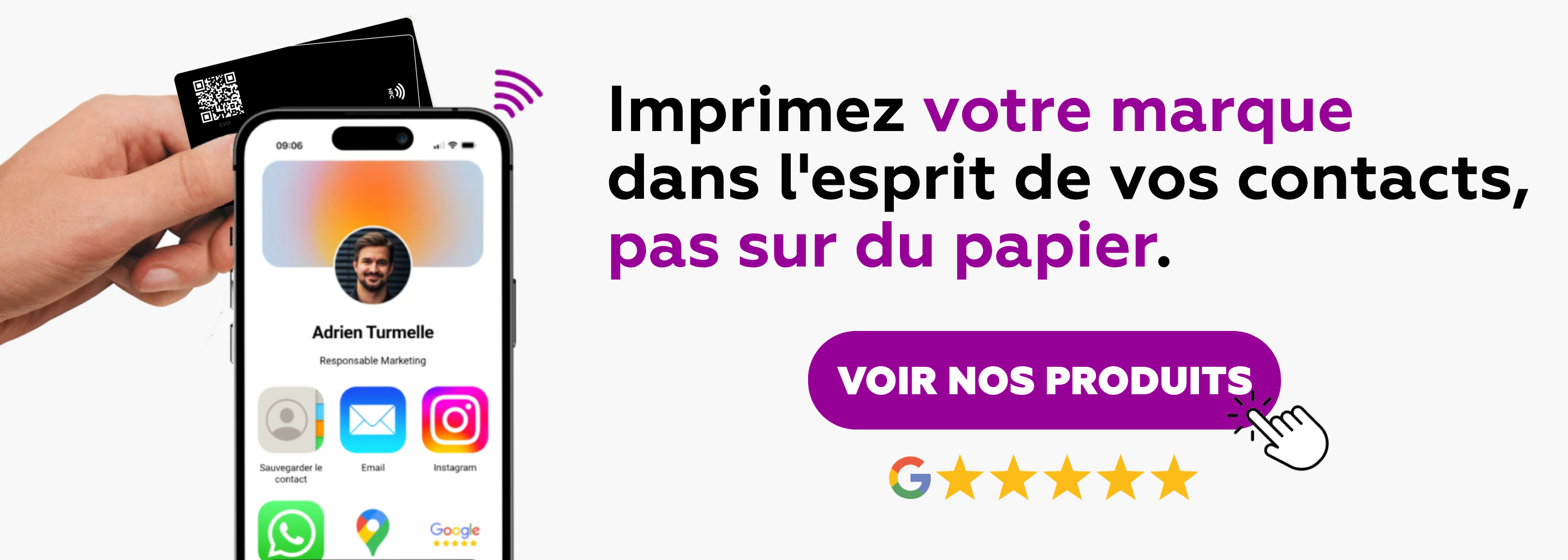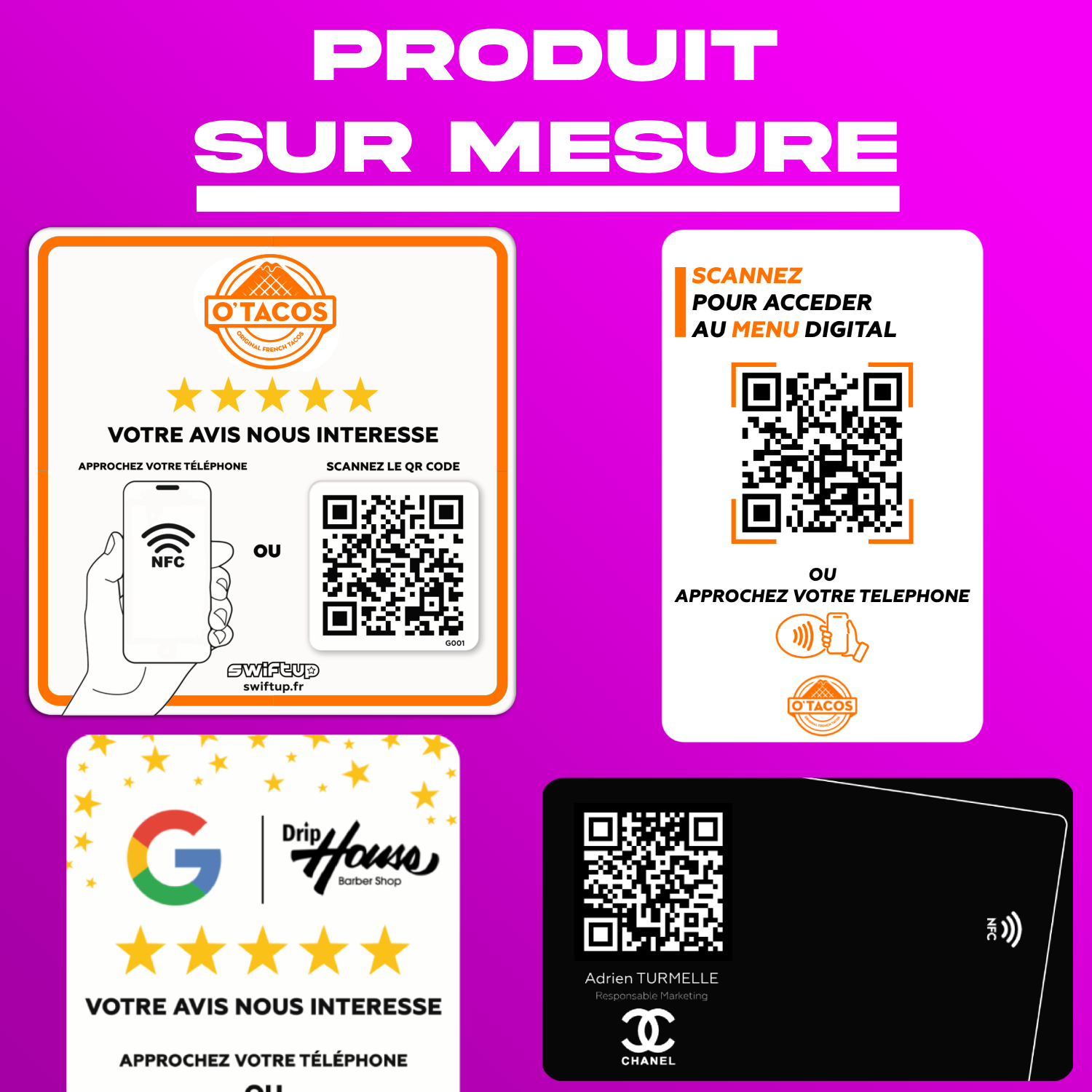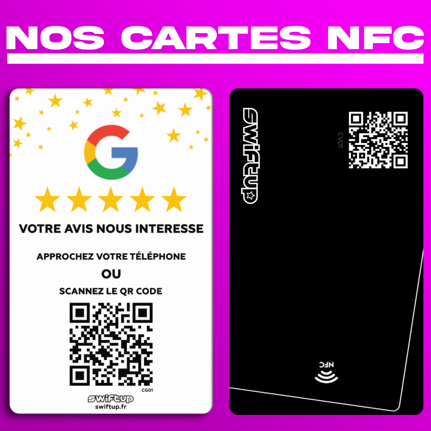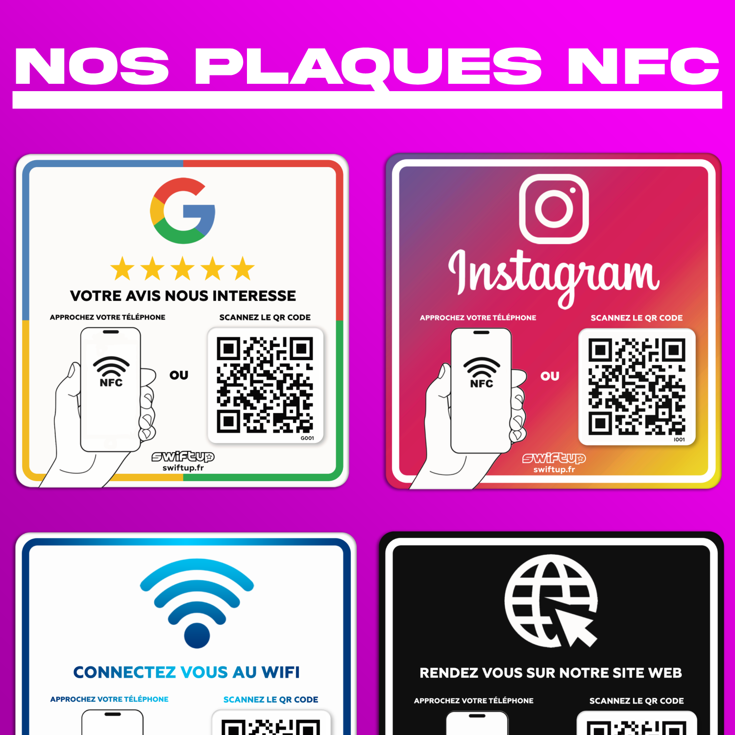 Le NFC (Near Field Communication) permet une connexion instantanée par simple approche du smartphone (sans application) grâce à une puce NFC. Vos clients approchent leur smartphone de la carte ou la plaque pour accéder à vos liens (avis Google, réseaux sociaux, site web, etc.) C'est tout !