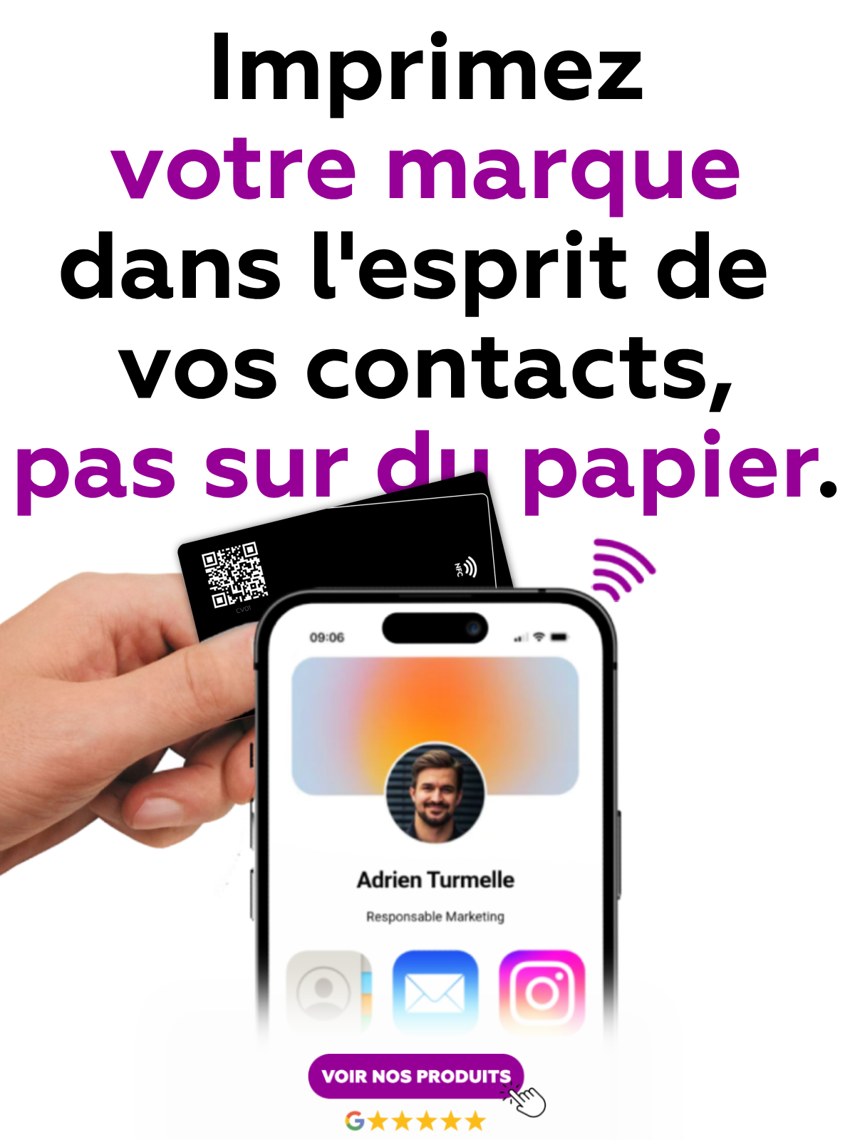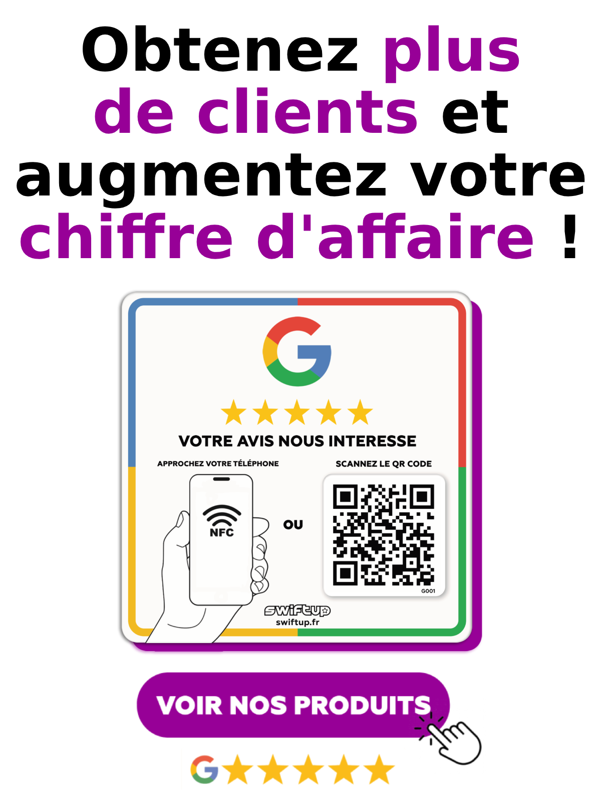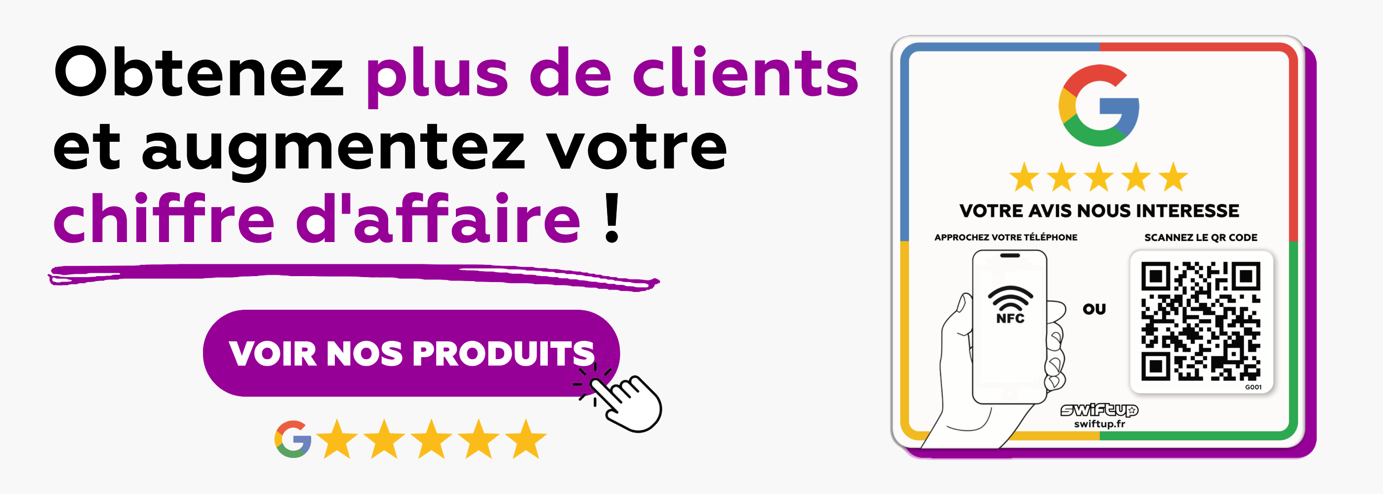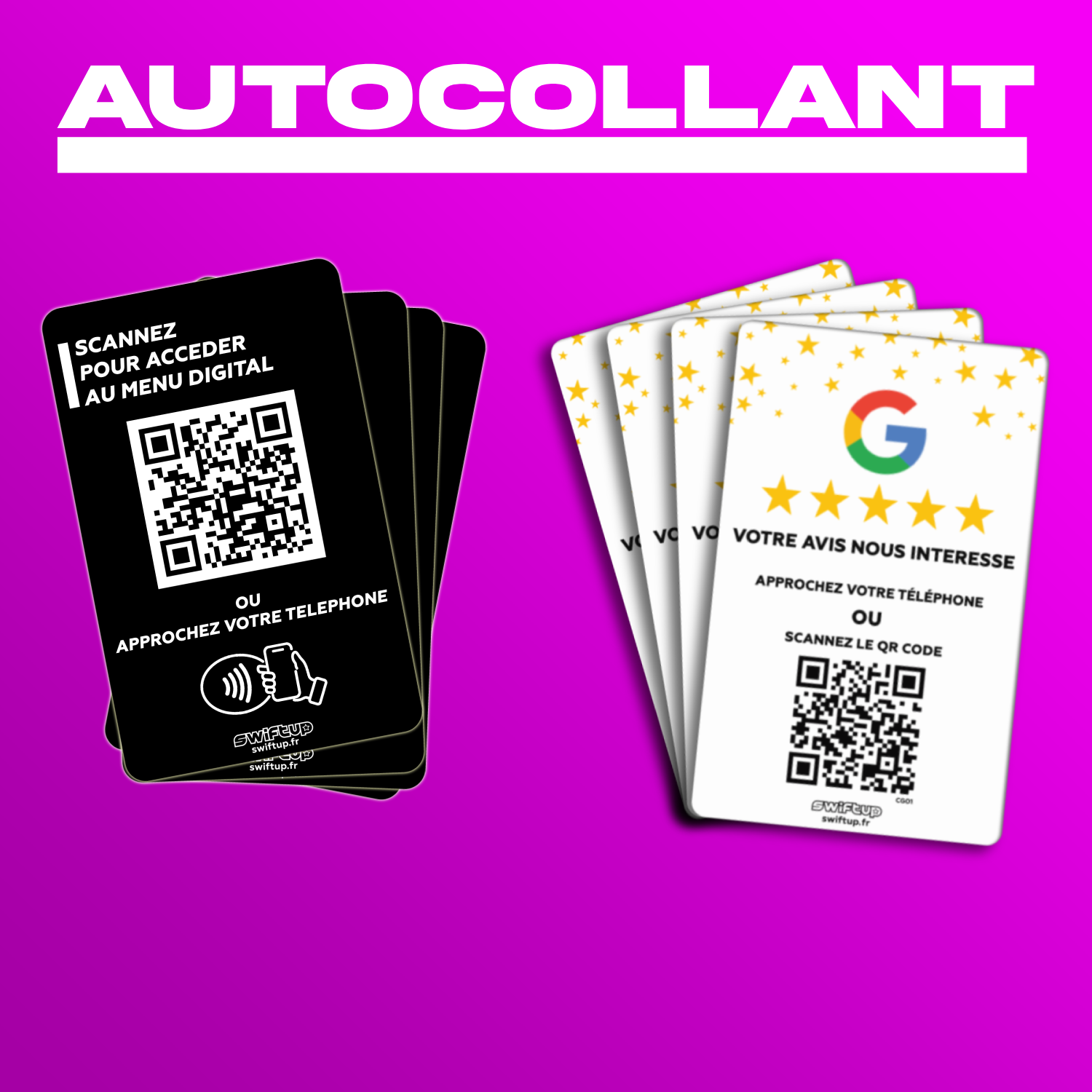 Le NFC (Near Field Communication) permet une connexion instantanée par simple approche du smartphone (sans application) grâce à une puce NFC. Vos clients approchent leur smartphone de la carte ou la plaque pour accéder à vos liens (avis Google, réseaux sociaux, site web, etc.) C'est tout !