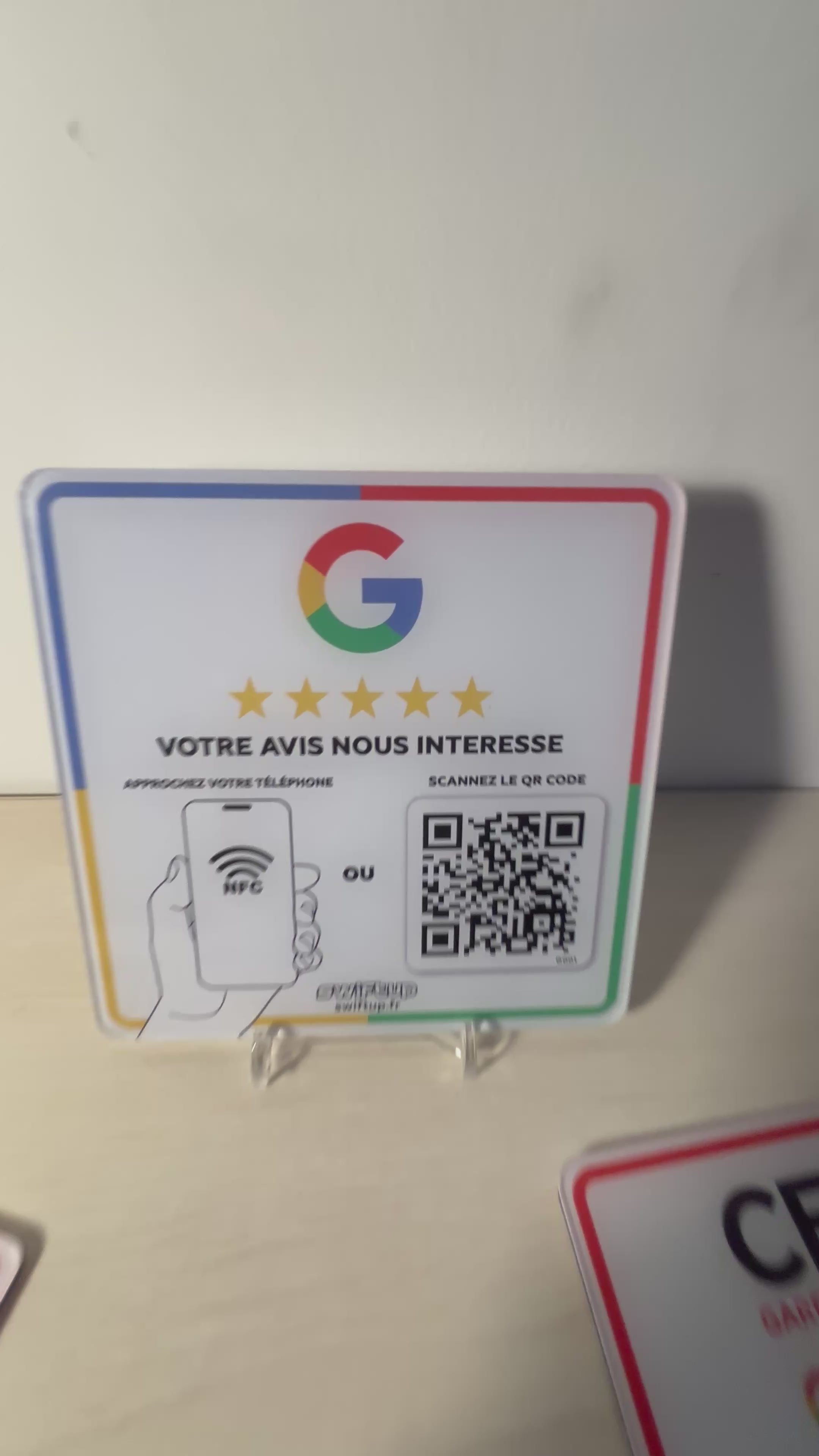 Le NFC (Near Field Communication) permet une connexion instantanée par simple approche du smartphone (sans application) grâce à une puce NFC. Vos clients approchent leur smartphone de la carte ou la plaque pour accéder à vos liens (avis Google, réseaux sociaux, site web, etc.) C'est tout !